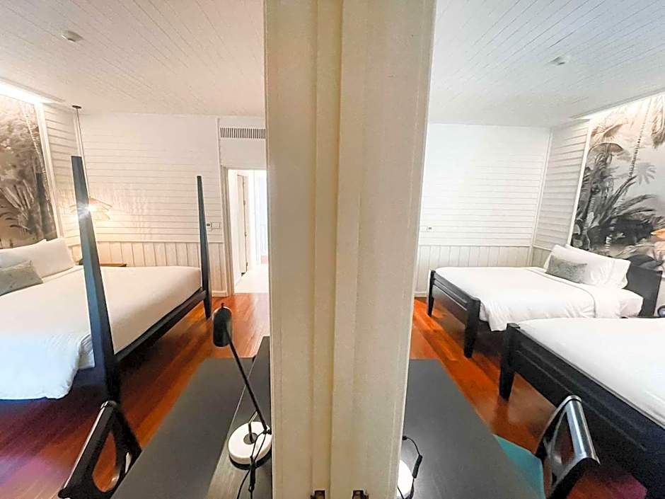 Elegant rooms featuring private balconies with views of our swimming pool oasis. Room with king size bed interconnects with a room featuring twin beds. Both rooms have private bathrooms with shower.